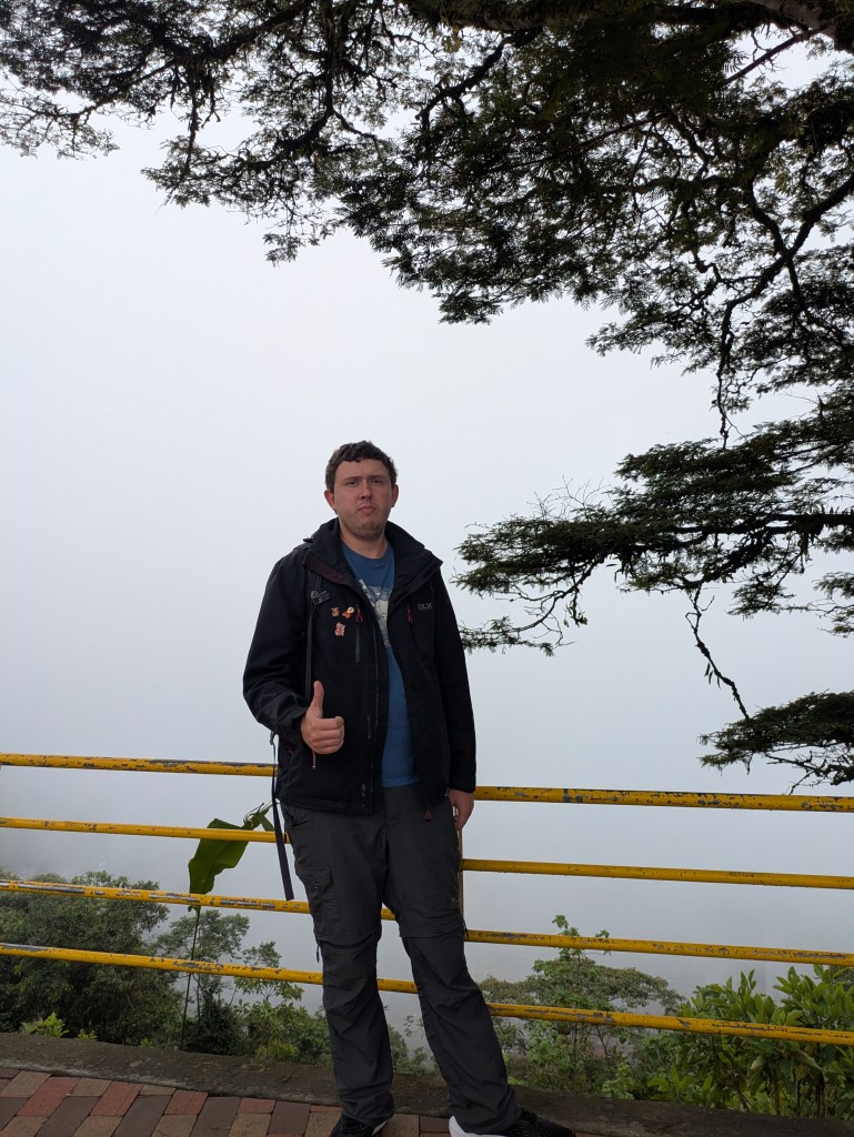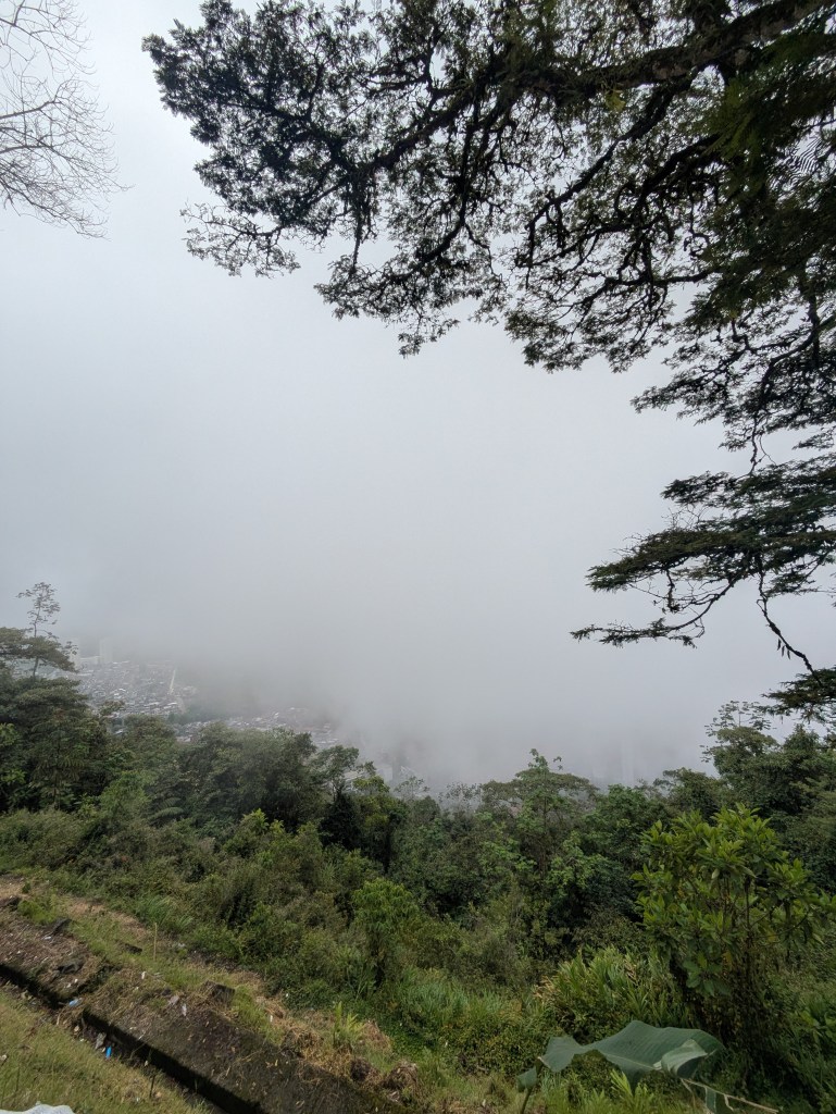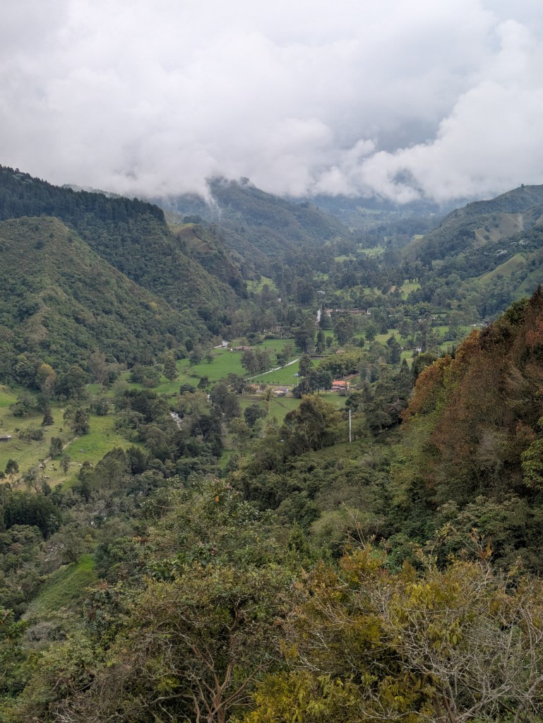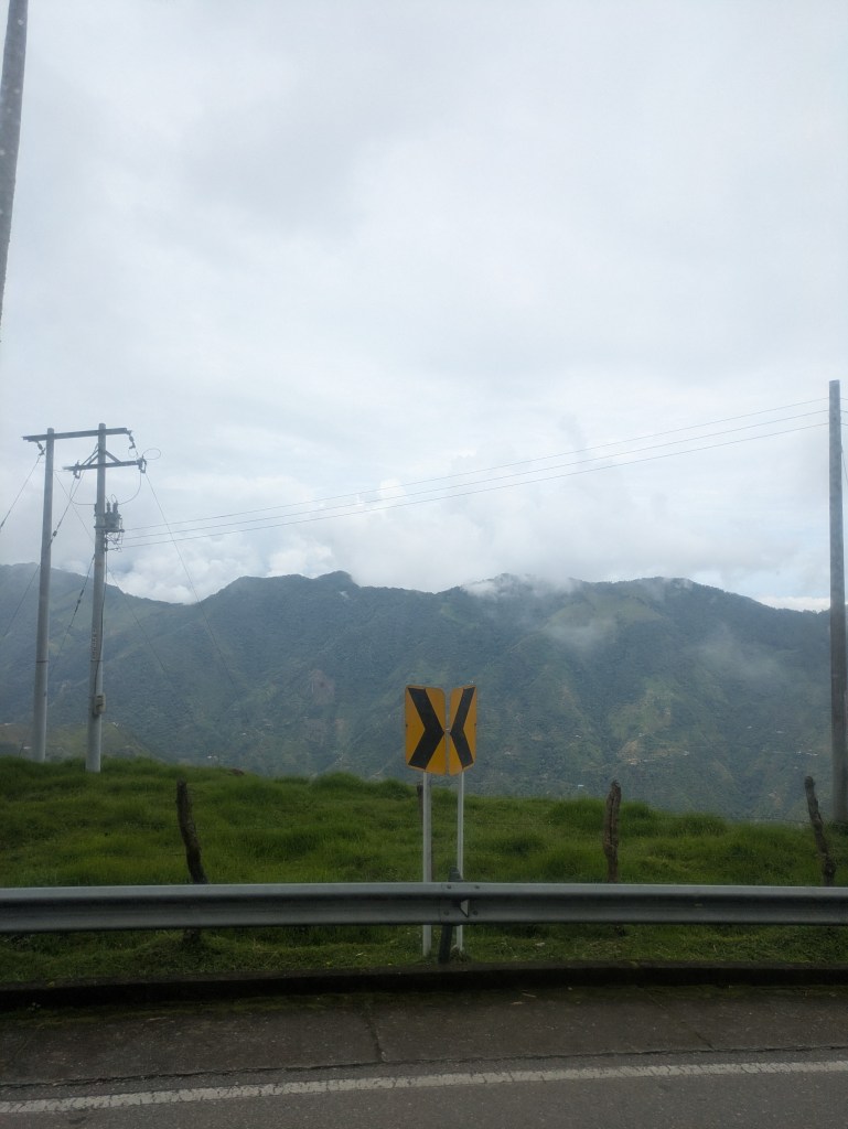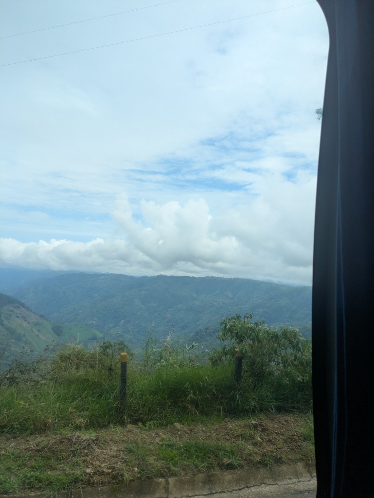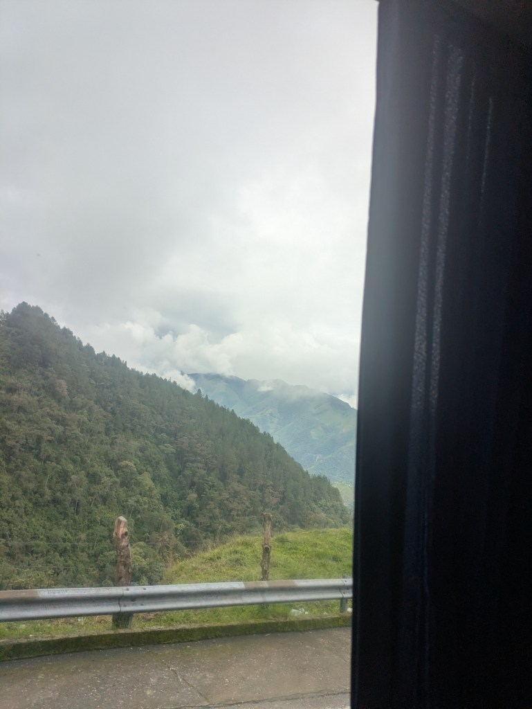 It wasn’t the earliest of starts out of Manizales. About half 9, I was out and on the cable car over to the bus station. After a short ride and a quick bit of breakfast we were on way by 11. This bus however was a full bus and unfortunately I got the worst seat being sat right behind the dark metal pane behind the drivers seat so could barely see much outside and there were a lot of twisty roads again much like the ride to Manizales. I don’t get car sick much but this was making me feel queezy. From what we could see weather was quite bad all the way up so naturally this slowed things down.