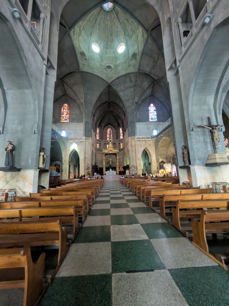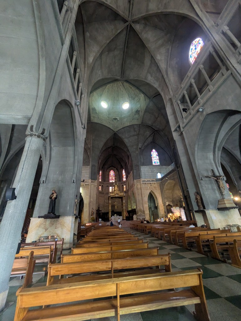The full name of this cathedral is The Cathedral Basilica of Our Lady of the Rosary (Catedral Basรญlica Metropolitana de Nuestra Seรฑora del Rosario) which is right in the city centre’s Plaza de Bolรญvar. It was built between 1928 and 1938 in a a gothic style replacing earlier churches here destroyed by the 3 previous mentioned fires in the 1920s. It took so long to build because they had to import various materials from Europe and North America that they couldn’t get in Colombia and shipments arrived very randomly, so work would often stop when they were waiting for something to arrive.