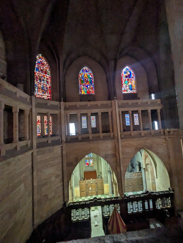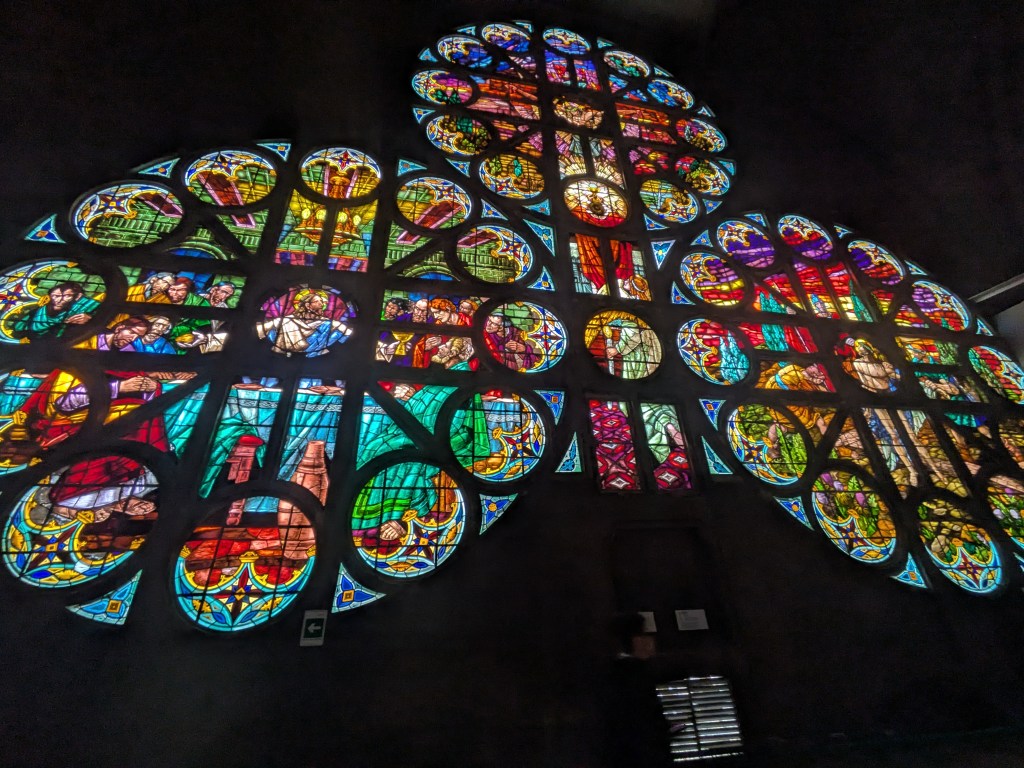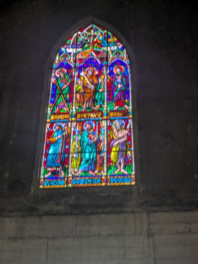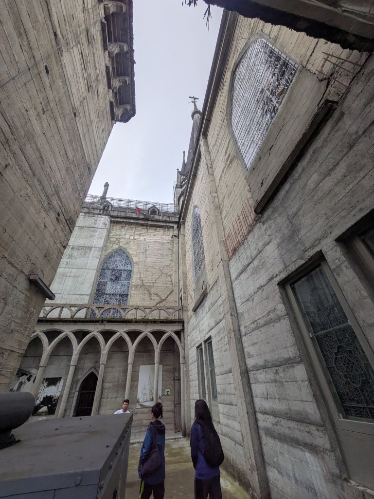 You can take a tour upstairs here for about ยฃ4. It is well worth the money as it allows you to see the panoramic views from it’s four corner towers and climb the spire and see all across the city and it’s valleys. Inside are numerous stained glass windows by different European and Colombian artists.