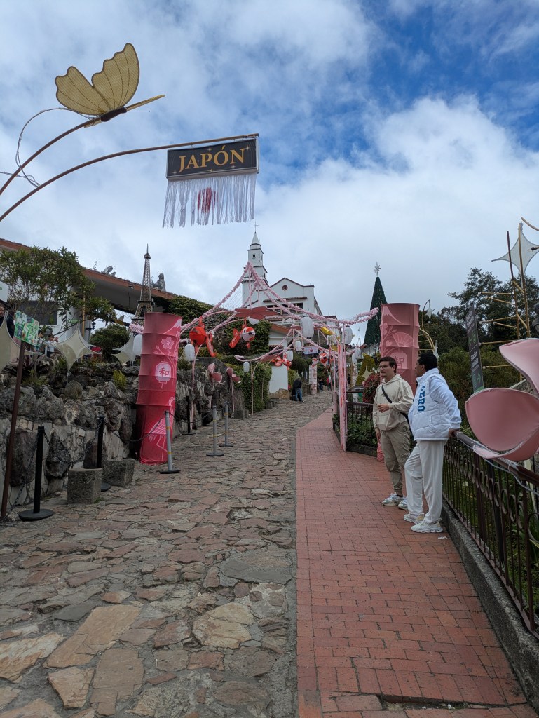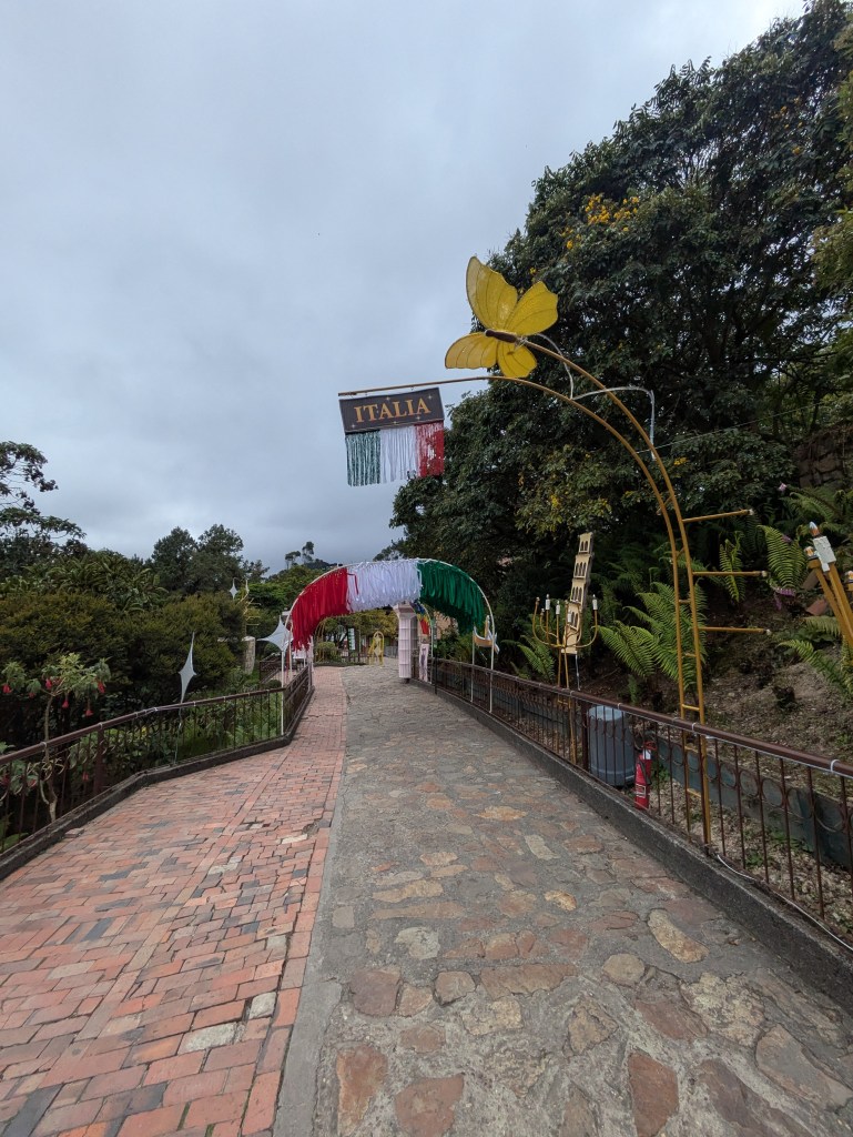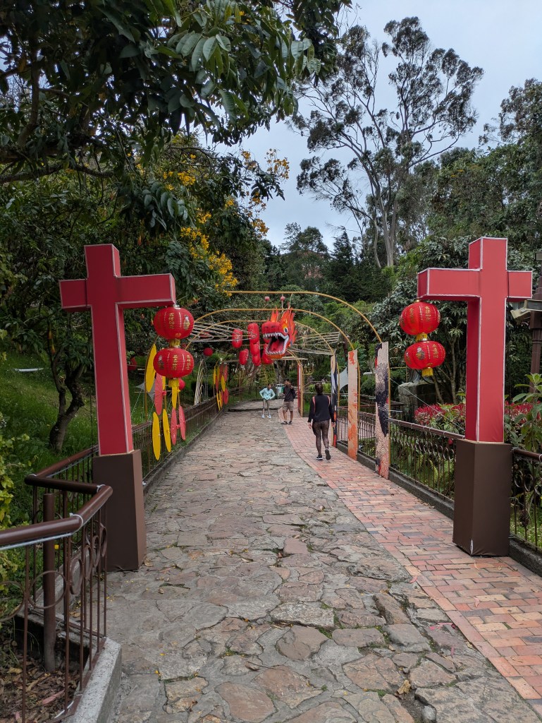 It is quite a quick ride up the mountain and soon we are up. It is quite a small place with a church and several stalls and restaurants. It’s a bit of a tourist trap up there to be honest but it’s got some lovely views of the city from up there and a little sort of trail with representations of different countries. From what I gather this is to do with this being a pilgrimage site both in the modern day and from when it was a holy site for the Muisca peoples – the native tribes which resided in Bogotรก before the Spanish came here.