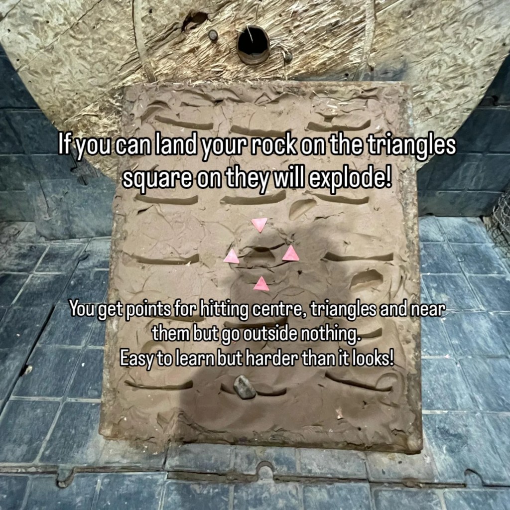 Tejo is a traditional Colombian pub game that in a way is a bit of a cross between Darts and Skittles, simple game but hard to master. Basically you have to throw a rock ‘puck’ at a clay board trying to hit these triangles and the centre. When you hit a triangle they are actually filled with gunpowder so you get a good pop similar to popping old school party poppers. You get points for hitting near the triangles, the centre and the triangles themselves. It is good fun and quite a workout actually since the rock discs aren’t that light. We weren’t really keeping score but have a feeling she won having played this before.