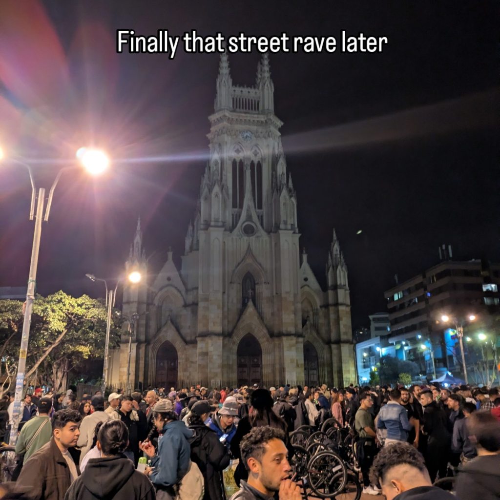Later that night I met up with Alejandro, a man I met back in Medellin who is an actor and is from Bogotรก, he was back in town so met up with him and some of his pals and we had a few beers at this street rave. The rave was a big celebration – they changed noise laws in this district which meant that parties can now go on till 6 am as opposed to 3 am! It was a good but short catch up. We then went out separate ways as I had to get myself sorted for the journey to Ibaguรฉ tomorrow.