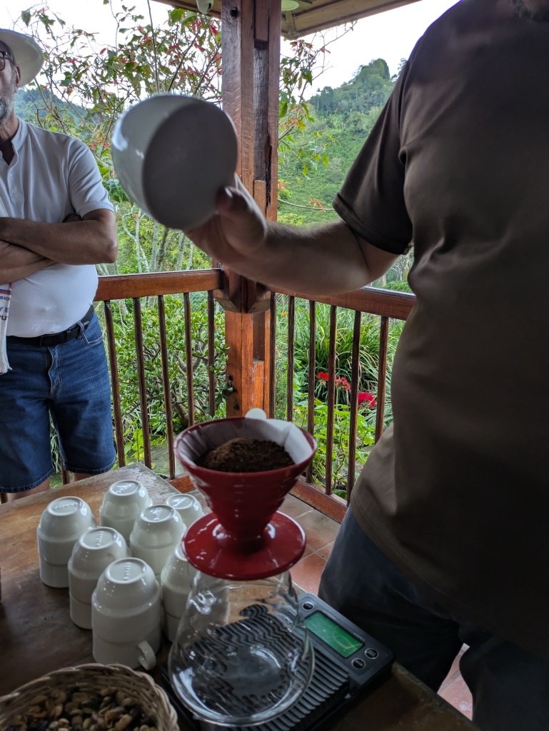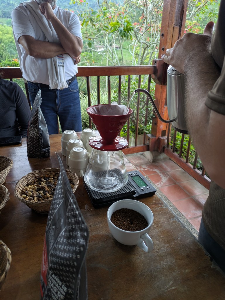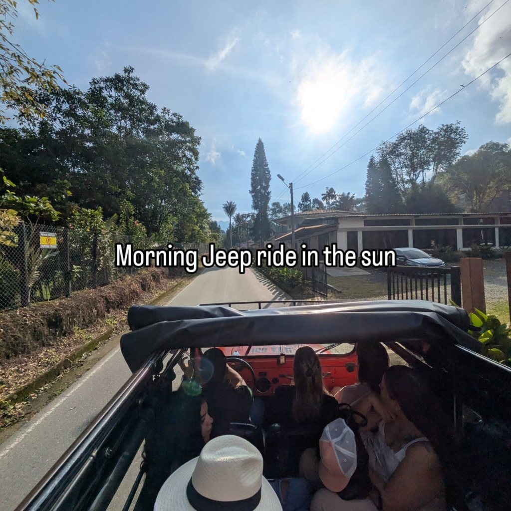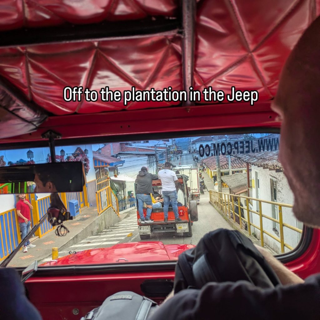 It is a bumpy ride and you certainly feel it in these Jeeps, whether your in the back, out front or stood up hanging to the railing at the tailgate. It is about a half hour ride and we are there. I join a group about to start the tour. Due to the difference in numbers the tour is done in Spanish. Now this was a hard one to follow as lots of words and phrases I didn’t know came up. The conclusion the end of it, is making coffee is bloody complicated!