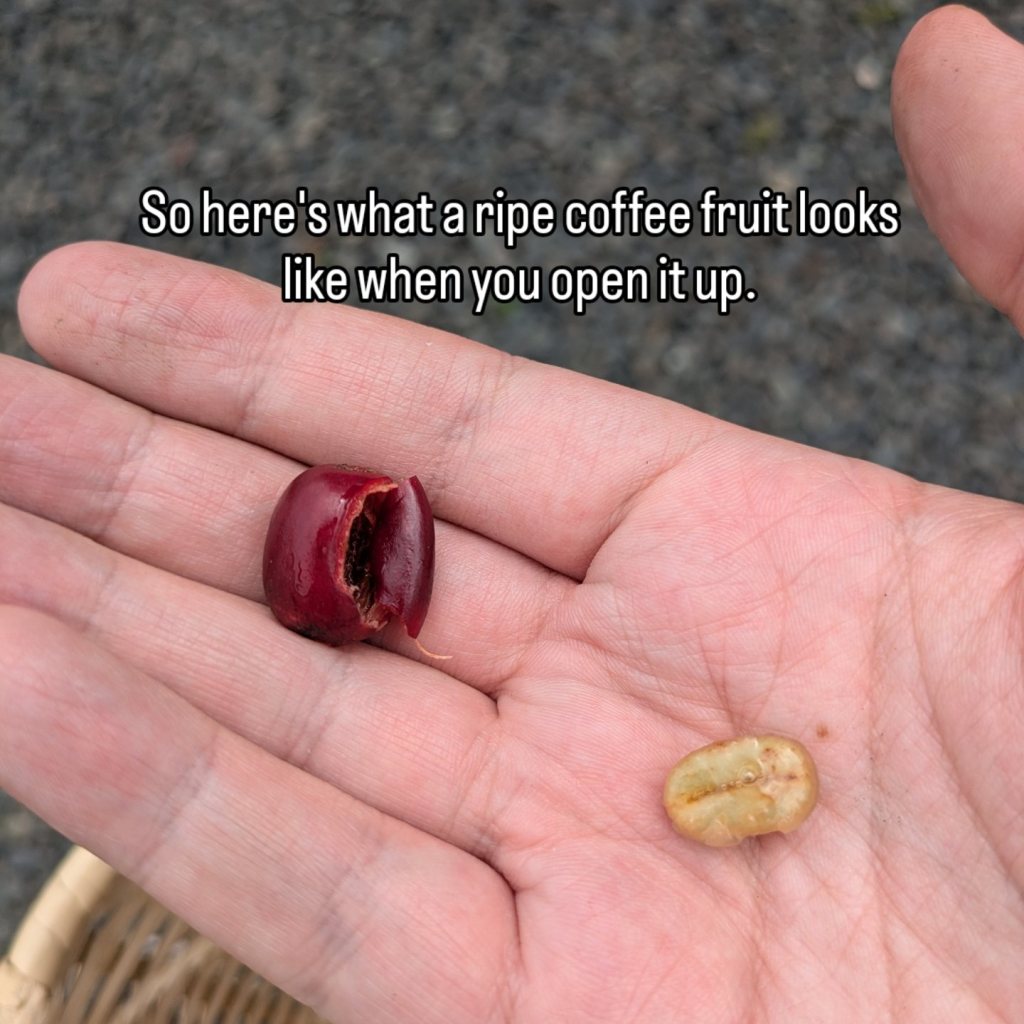 From there they show us the berries. The coffee berries need to be read before they are ready. Green ones are not. Forgot to mention they dressed us up in ponchos and gave us baskets to pick some and look the part while doing it.