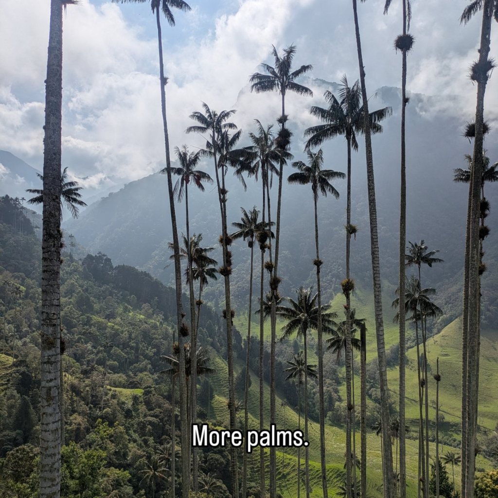 We soon arrive and off I go to the trail. Starting off you walk up a road until you come to a sort of farm house where you pay the entrance fee of about ยฃ6 and in you go. As you enter you are greeted by 60+ meter high palms, which are a special species native to that valley, don’t ask me the name though.