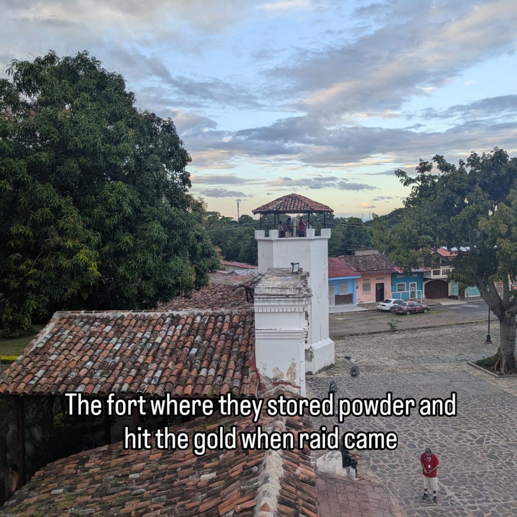 Granada and León were often rival cities for who should be the capital of the colony. The León i was in yesterday is actually new León. The first one got destroyed by a volcano after 30 years and they relocated it some miles away. He talks about the lake and this was how Nicaragua got it’s name. There is a river that feeds into this lake called the San Juan and it goes all the way out to the Carribbean sea. The Spaniards sailed up here in 1522 looking for a passage to the Pacific and met the local chief ‘Nicaga’ I believe his name in modern day San Jorge then sailed up north and founded Granada. Nica agua – Nicaragua.
