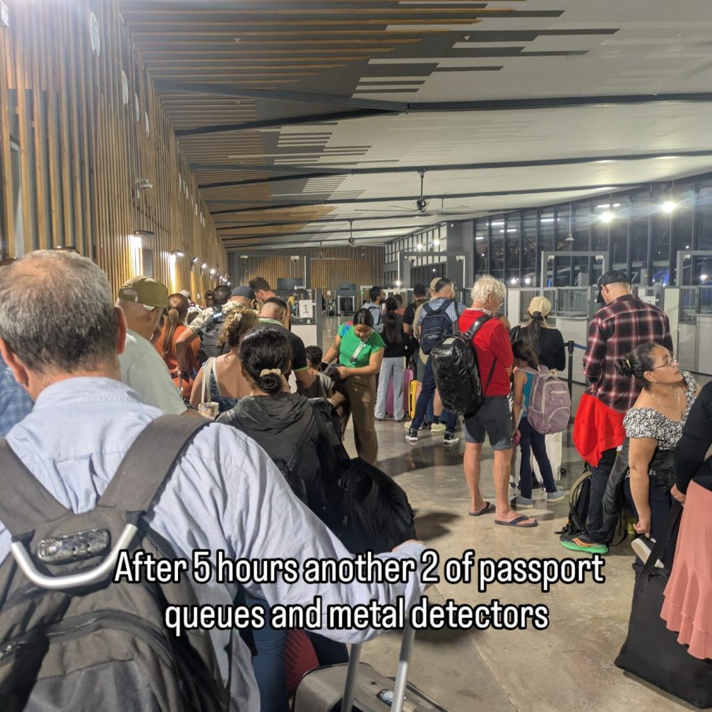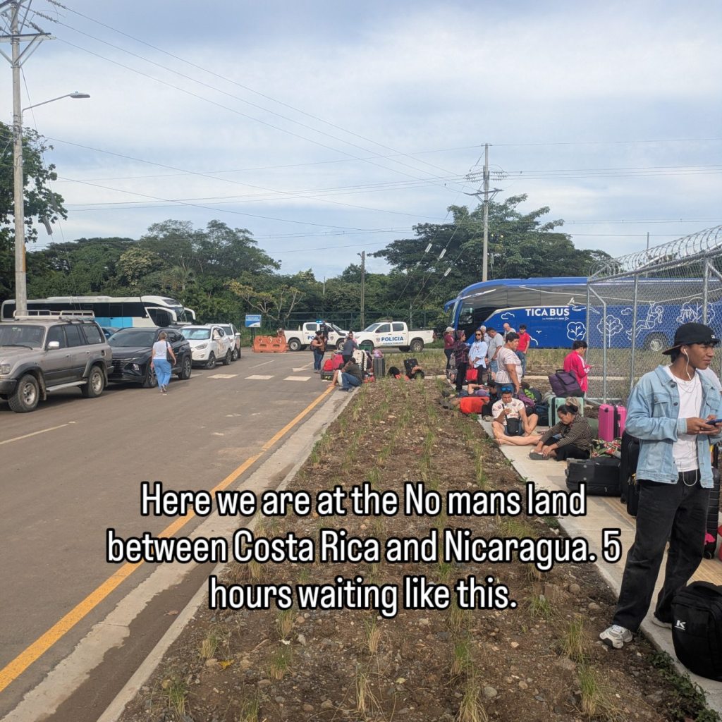 Now back on the bus we go. 2 minutes later we have to debus with all our gear again to do it all again on the Costa Rica side. Off we go do the bunfight again then are told to walk to this gate where we are then just told to wait here. 1 hour goes by. Crickets. 2 hours goes by. Crickets. 3 hours in one of the guys they let across to use the bathroom briefly says this is because of a powercut and their systems are down and cant process anyone. This goes on for another 1.5 hours until people start coming in from the other side and I manage to ask the guard about noticias con la electricidad and he tells me we are back on but we’re dealing with the backlog on the leaving side first.