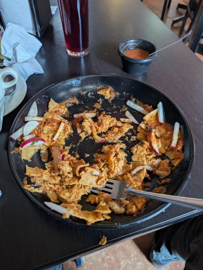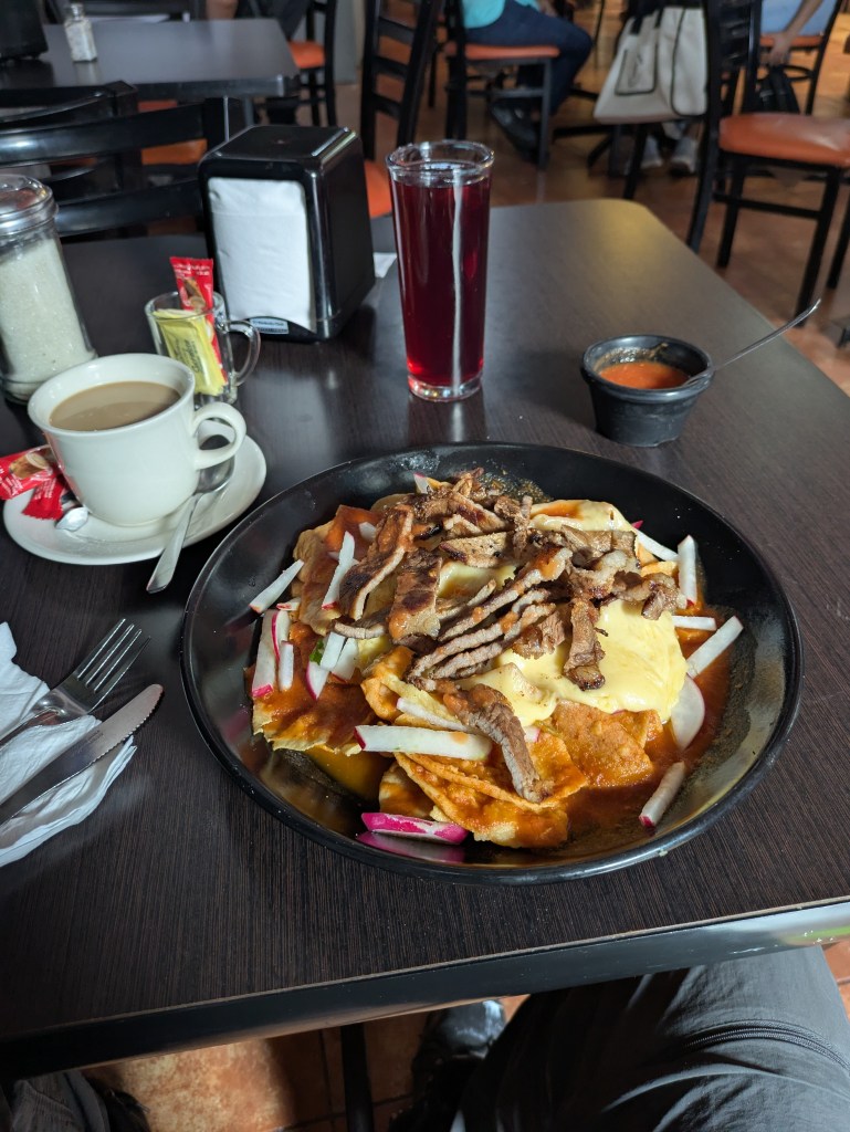 Hola todos. After awakening in that hovel I book my ticket out of there and a place in San Cristóbal de las Casas and make my plans to get gone. It’s a 1 hour trip up to San Cristóbal but check out is 12 in this place so go out to get some breakfast. Desayuno rancho it was, eggs pork and nachos with spices and peppers. Was pretty nice.