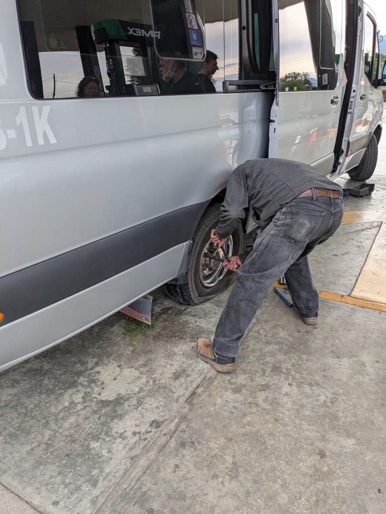 About 0700 we are on the road proper. Goes smoothly till about 0830 when we have a routine stop at a garage halfway to Comitan. We are about to leave but then we pull back in. Joder we got a flat tyre! There is a spare on the bus but it takes a long time for them to change it largely because the wheel nuts are very rusted and no WD-40 in sight and not having the right size iron for it. Eventually we get the nuts off and spare tyre is fitted and back on the bus we go. We drive to the border on the spare for another 2 hours without incident.